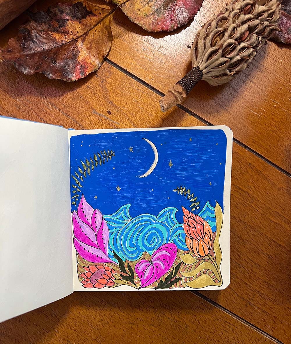 Which brings me to the chaos of life. How do we find that flow to create things when we are sick, stressed out or just anxious? For me, I just curl up on the couch in something comfy, grab my sketchbook or iPad and just start making marks. I can’t say I always want to. This month an Illustrator I love partnered with a magazine I love and announced The Great Outdoors creative brief. They asked “What natural landscape would you pick to express your creative personality?” I really wanted to make sometimes but I didn’t feel like I could. I was inspired by the idea but felt it just wouldn’t come together. I was too ill and needed to work on other stuff. But then I just decided to sketch. I joined a group on Instagram doing a 100 Day Project. I bought a little sketchbook (less intimidating) and committed to a simple sketch daily. It keeps me drawing and I find little bits of magic here and there. So I started to sketch little landscapes. I knew the landscape of Hawaii with the water and tropical plants was where I wanted to head.