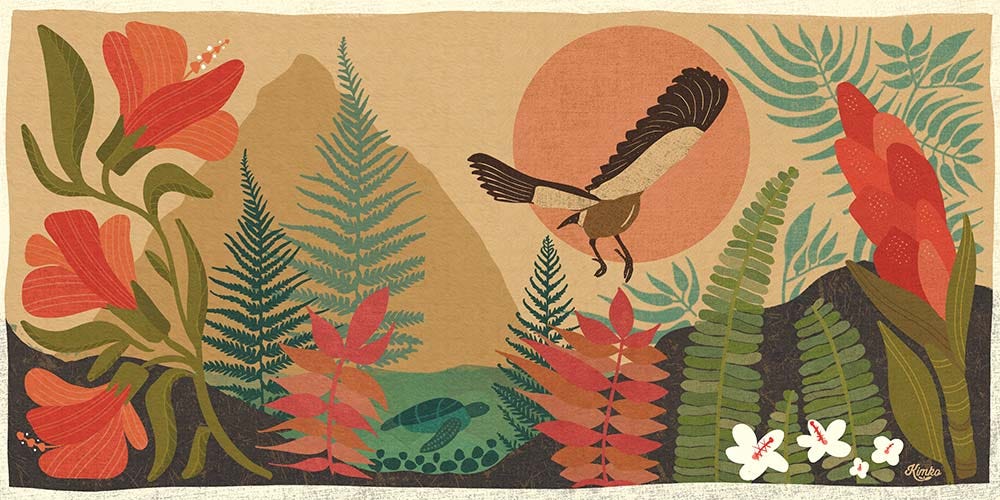 After a week of doing little doodles with paint pens, I decided to pick up my iPad and just start building my landscape. I remembered this postcard I bought there over a decade ago of a hula dancer. It was printed on a brown kraft paper and felt like a vintage illustration back when they would paint pin-ups on the side of World War II planes. I have the image in my mind, but have lost that postcard since. And slowly, day after day, my landscape began to emerge.