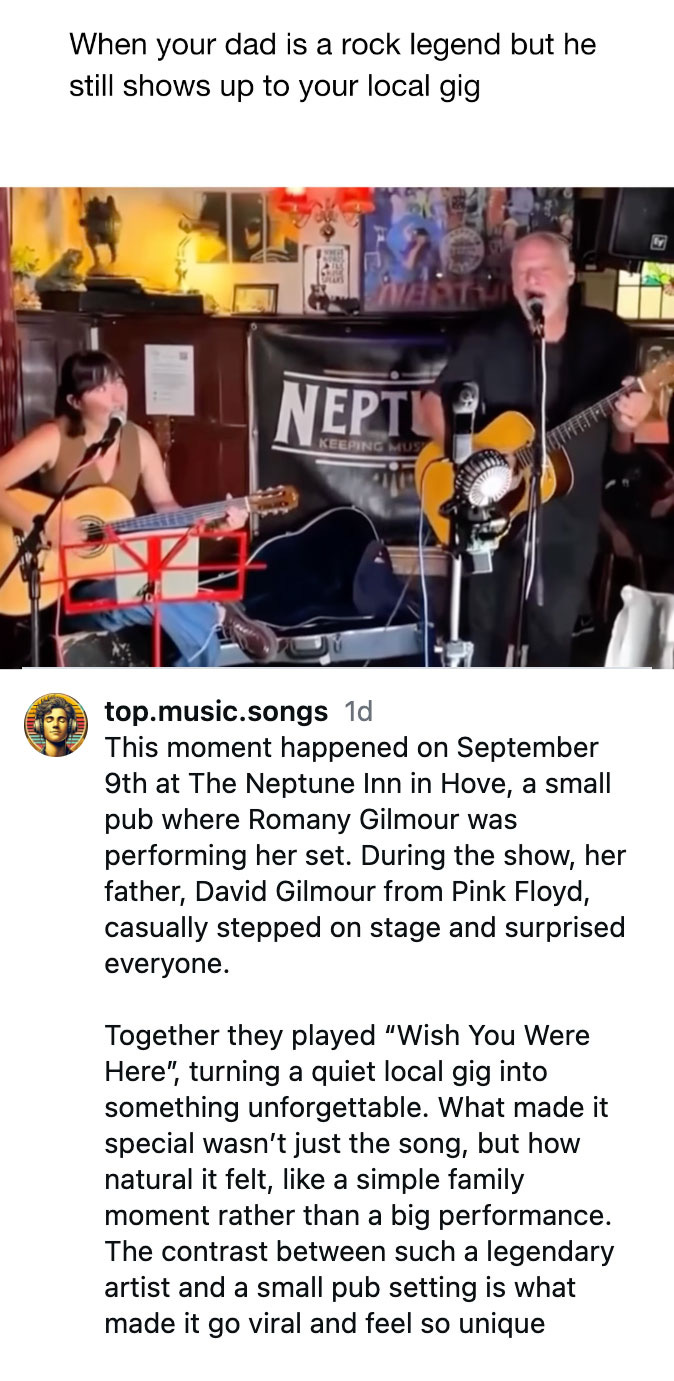 A member of Pink Floyd shows up in a bar to sing I Wish You Were Here with his daughter.