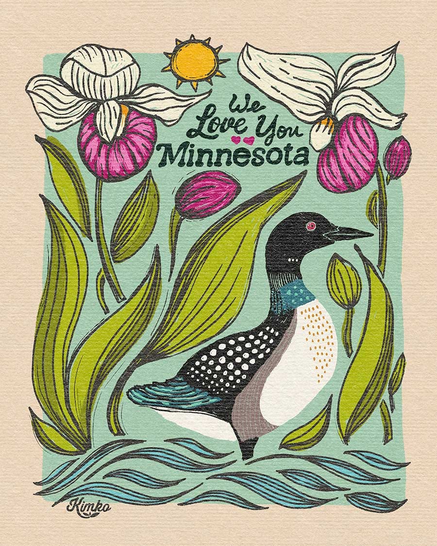 I dropped all my regular work on Monday and made this. It is the Minnesota state bird - the loon, and the Minnesota state flower - Lady Slippers. I was so inspired by the people of Minnesota and how they continue to show up.