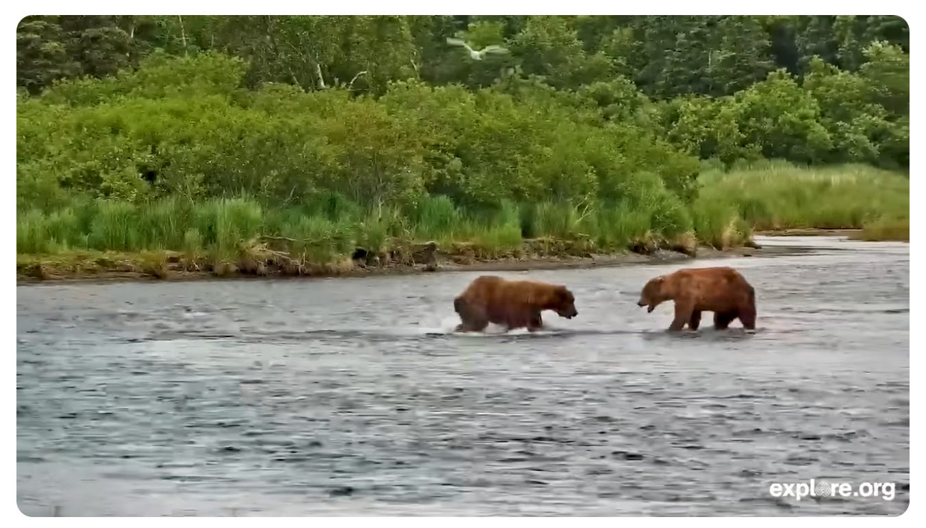 So there you have it, bears are magic. Have you ever watched a bear cam on YouTube? When they wake up, they go to the river to catch salmon. Sometimes you see a huge bear stroll in, and it is mesmerizing. It is a little early for those cams, but here is a link to a little video of past footage. Be aware. Sometimes you stumble into a rabbit hole of delight and lose an hour - but it is the good kind of scroll.